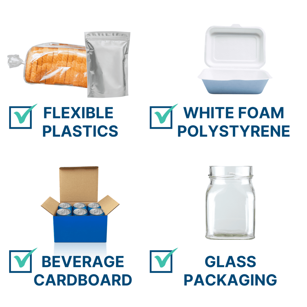 Glass, flexible plastics, white foam polystyrene, and beverage container cardboard can be dropped off at a depot near you for recycling!