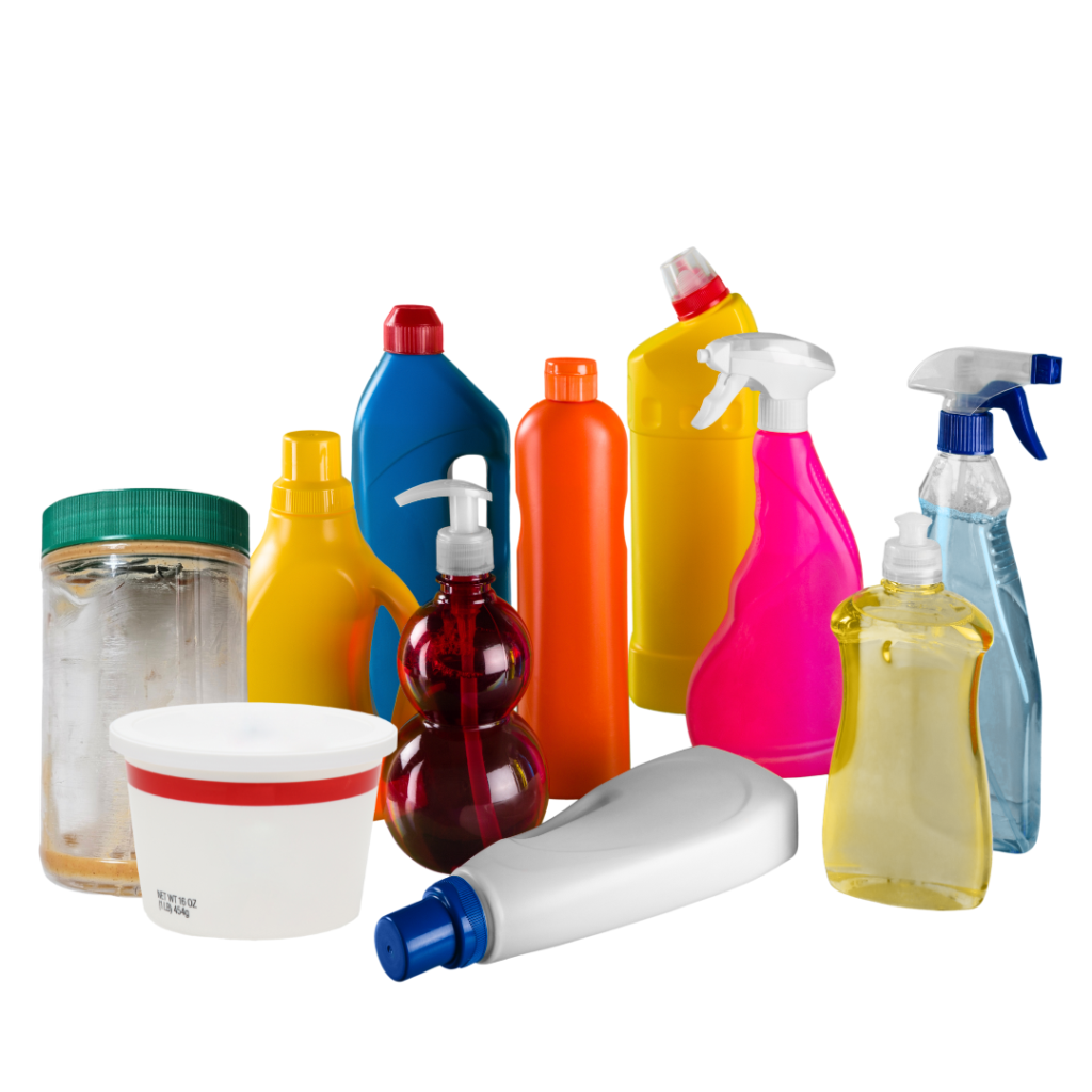 Laundry detergent and household cleaner jugs, shampoo, body wash, salad dressing, condiment, dish soap, mouth wash bottles.